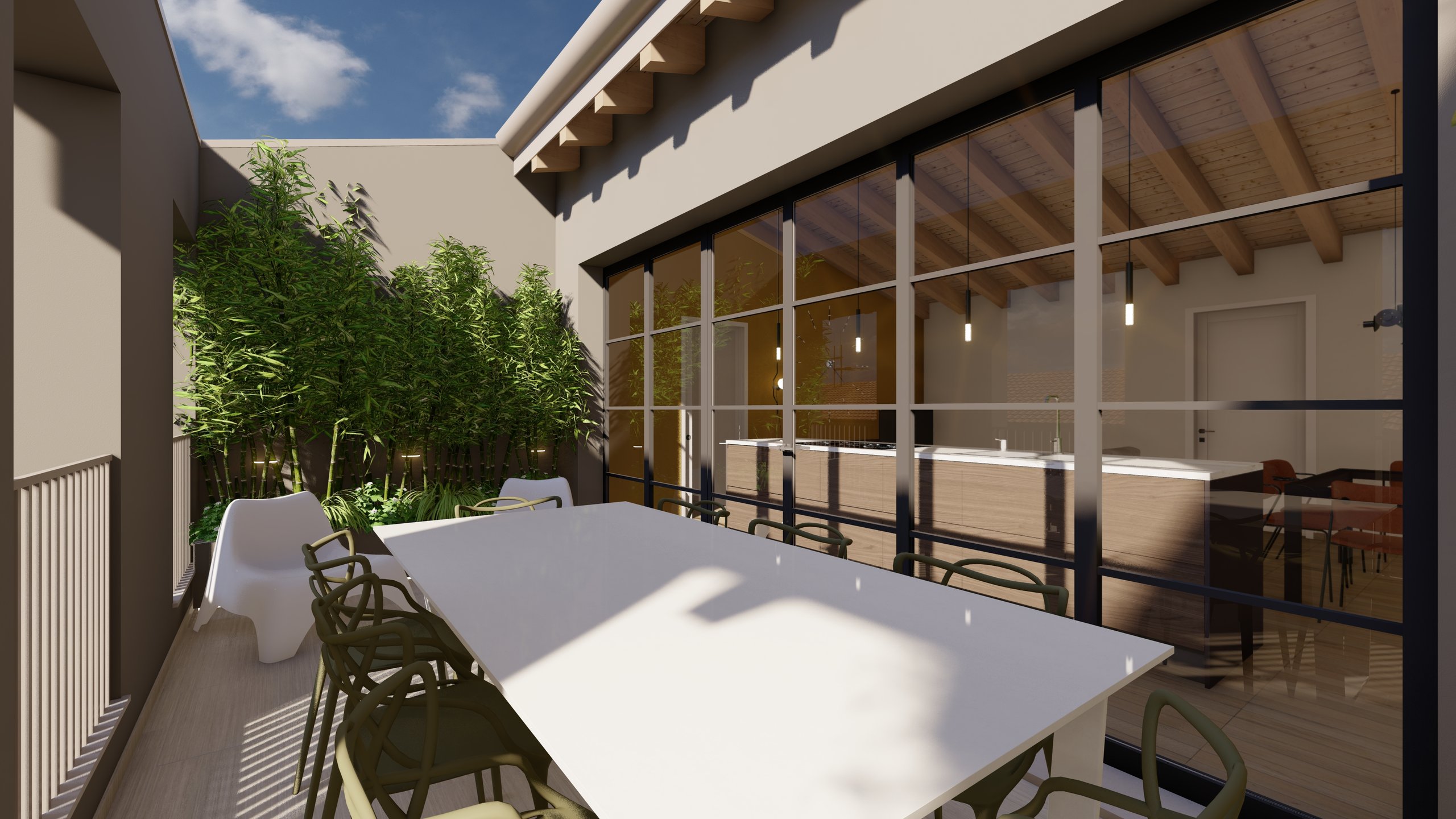 Gli interni spaziosi, rifiniti con materiali ricercati, si fondono armoniosamente con l’estetica accogliente del legno e con ampie aree living luminose.